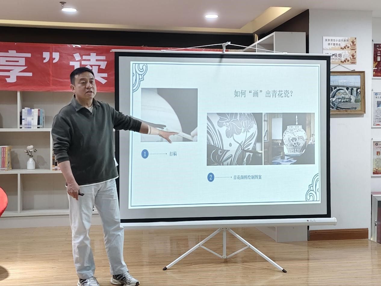 活动中,崔宽老师从青花瓷的起源、发展脉络讲起,详细解读了青花瓷“白釉青花一火成,花从釉里透分明”的工艺特点,以及缠枝纹、回纹、如意纹等经典纹样背后的文化寓意与吉祥内涵。通过丰富的馆藏瓷器图片与艺术鉴赏知识,崔老师带领同学们沉浸式领略了青花瓷作为“国瓷”的艺术价值与文化底蕴,为后续手工活动奠定了文化基础。